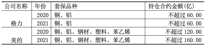 2020年4月,格力、美的相继发布针对大宗商品进行套期保值的专项公告,公告显示:格力集团将于2020年和2021年采用相同的套期保值策略,即对公司铜、铝原材料进行套期保值,套期保值业务的持仓合约金额每年不超过人民币60亿元;美的集团2020年拟开展的大宗原材料期货业务品种为铜、铝、钢材、塑料、苯乙烯等,涉及的主要结算币种为人民币、美元,预计期货业务的持仓合约金额不超过人民币120亿元,2021年在原先套保品种的基础上直接提升持仓合约金额至160亿元(见表1)。