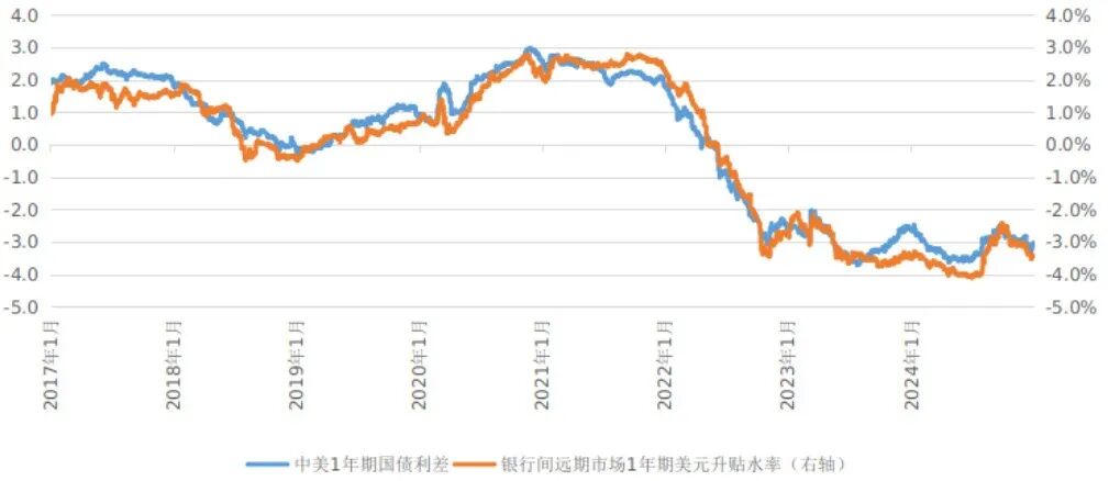 中美利差倒挂导致远期美元由升水转为贴水。2022年以前,人民币利率高于美元利率,中美保持正利差,人民币对美元远期汇率表现为远期美元升水。为抑制高通胀,2022年3月至2023年7月美联储连续加息525个基点,导致美元利率高于人民币利率,远期美元也由升水转为贴水,2024年末1年期美元贴水率(贴水点/即期汇率)为3.4%。由于美元利率在全球主要经济体中处于偏高水平,国际外汇市场上远期美元普遍呈现贴水,2024年末1年期美元对日元、欧元、瑞典克朗、加元的贴水率分别为3.9%、2.0%、2.0%、1.4%。