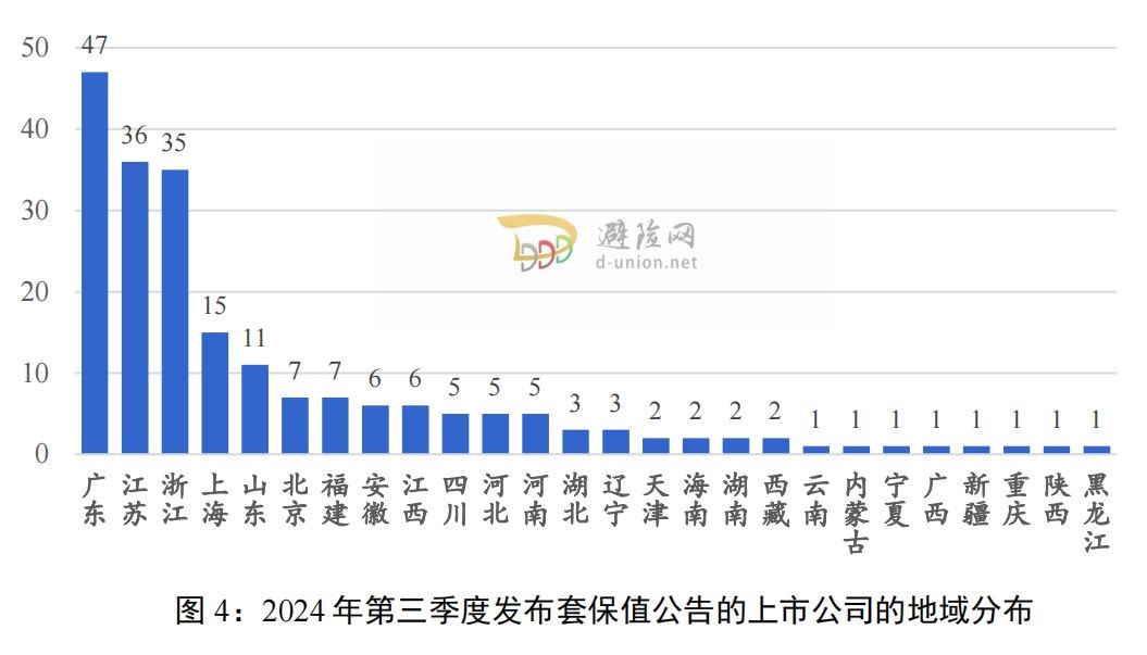 2024年第三季度发布套保相关公告的A股上市公司,从地域来看,广东、江苏和浙江位列前三甲,远超其他省市(如图4所示)。