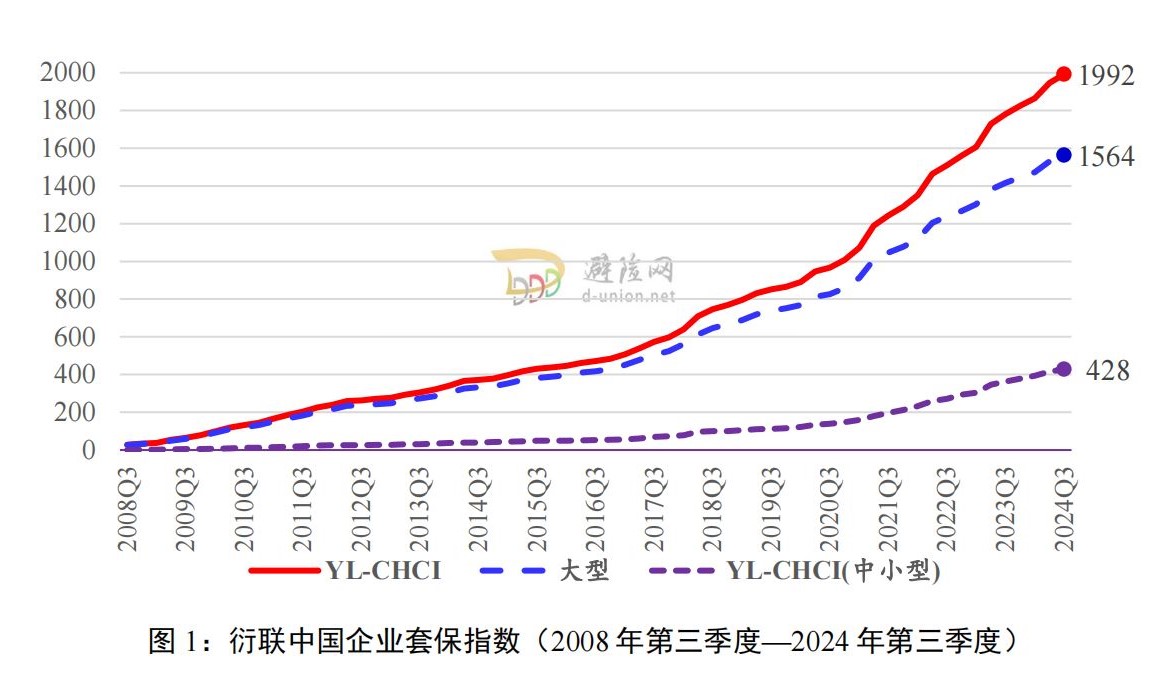 2024年第三季度末,衍联中国企业套保指数(YL-CHCI)达1992,较上季度末增长了2.42%,较去年同期增长了11.85%;其中,大型企业套保指数为1564,中小型企业套保指数为428(注:因规模划分采用最新数据故按规模统计的套保指数历史数据可能会与过往发布数值稍有不同)。2008年第三季度以来衍联中国企业避险指数历史走势如图1所示。